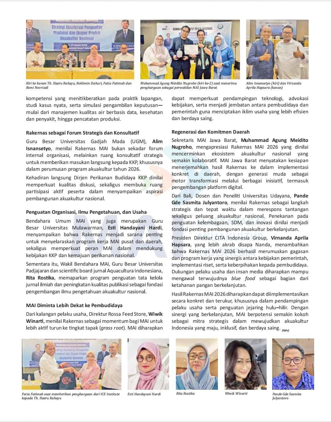 Rakernas dihadiri pengurus MAI pusat dan daerah, akademisi, pelaku usaha, jurnalis, serta para pemangku kepentingan lintas sektor. Pendekatan pentahelix melibatkan pemerintah, akademisi, dunia usaha, komunitas, dan media menjadi fondasi utama dalam merumuskan arah program dan kebijakan MAI periode 2026–2030. Diskusi menekankan pentingnya kolaborasi, inovasi, dan penguatan kapasitas SDM sebagai kunci peningkatan produksi dan ekspor akuakultur nasional.